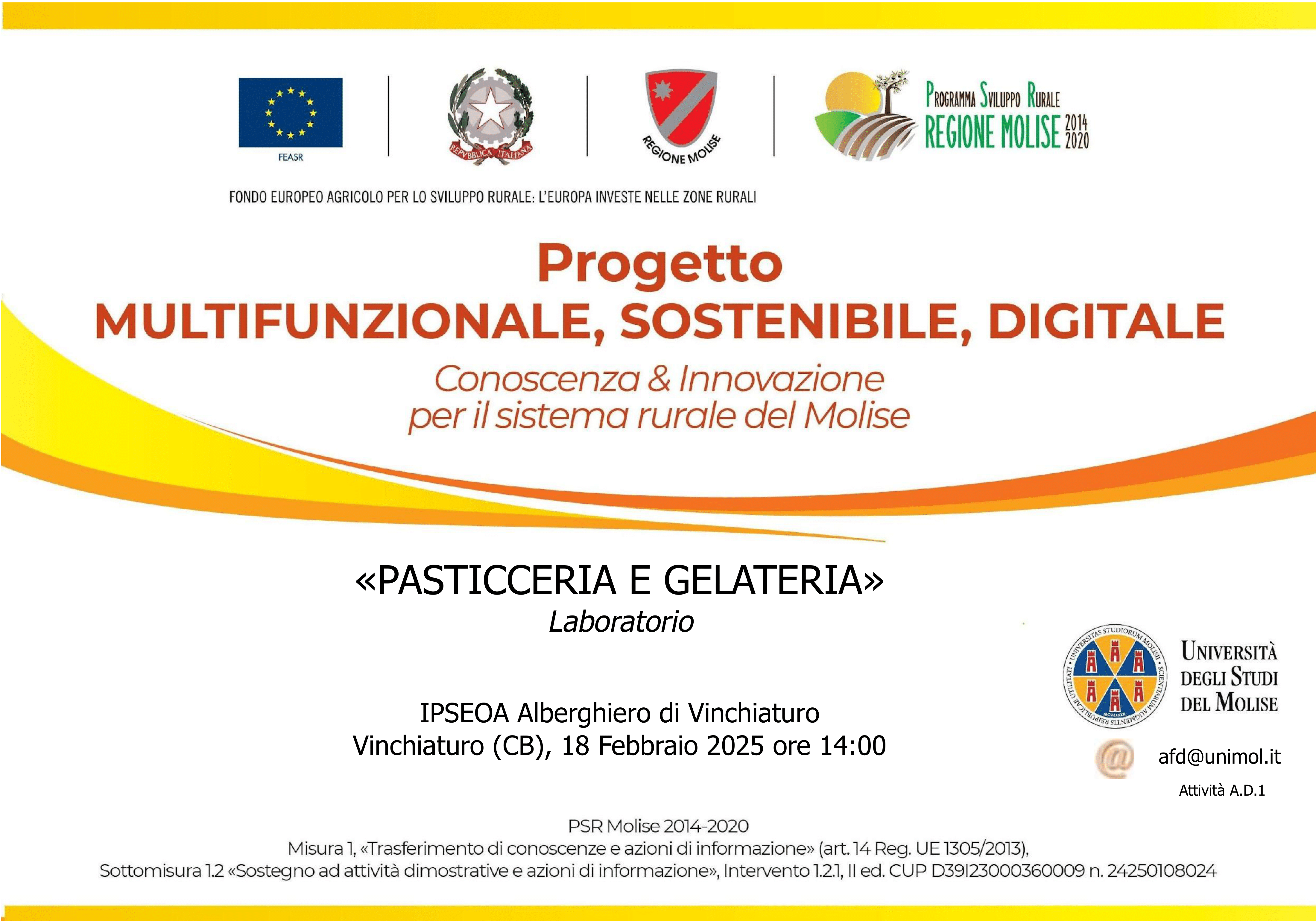 Il 18 febbraio, l’IPSEOA di Vinchiaturo ha ospitato il Laboratorio di Pasticceria e Gelateria dedicato nell’ambito del Progetto alla valorizzazione delle materie prime molisane attraverso la pasticceria e la gelateria.